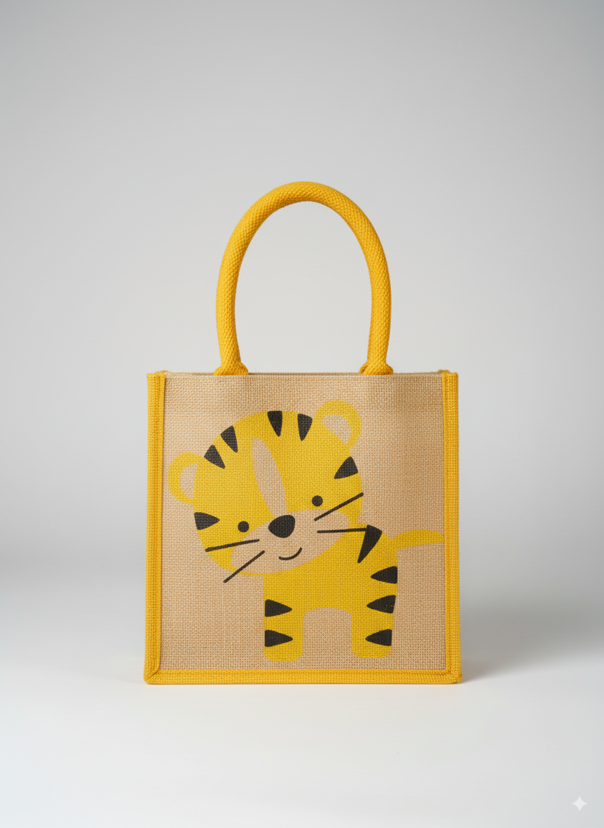 Add fun to your errands with this eco-friendly jute tote bag featuring a cheerful yellow tiger design. Durable, reusable, and perfect for kids or adults.