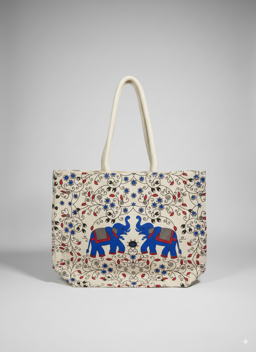 Carry style and tradition with this eco-friendly cotton tote bag featuring vibrant blue elephant prints and floral designs. Perfect for shopping or daily use.
