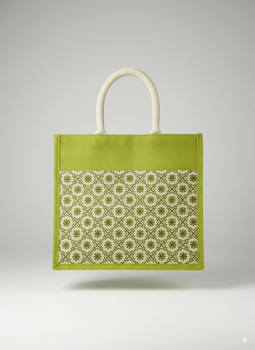 Eco-friendly green jute tote bag with floral pattern design and durable rope handles – perfect for shopping and everyday use.