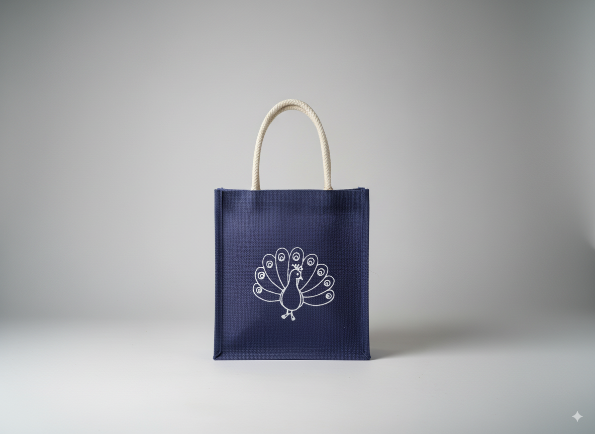 Stylish navy blue jute bag featuring a white peacock print. Durable, eco-friendly, and perfect for shopping, gifting, or daily use.